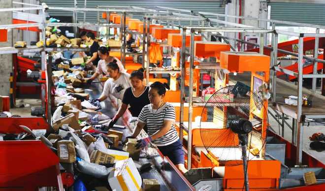 8月14日,工作人员在江苏省连云港市公共配送中心分拣快递。