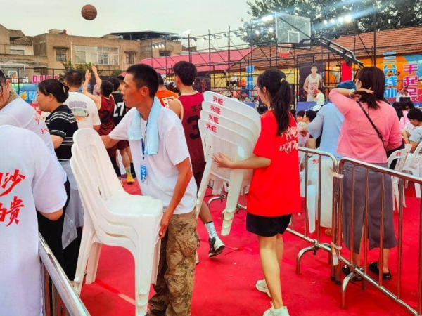 沙河镇“赣超”比赛现场志愿者忙碌的场景