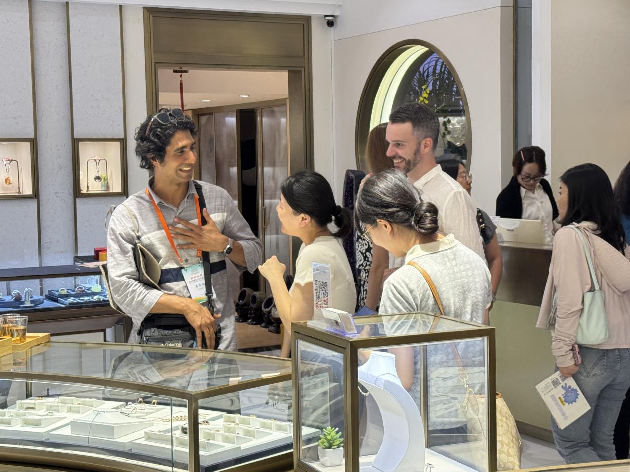 而在中国东海水晶城,采风团看到一家家商铺,五颜六色、种类繁多的水晶饰品“晶彩璀璨”;散客和采购商仔细挑选商品并与店家议价;部分店铺工作人员忙于线上直播,甚至用日语、韩语与海外客户交流;手工串珠的工作人员亦是随处可见。