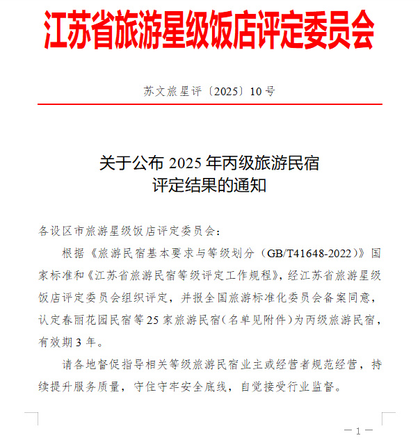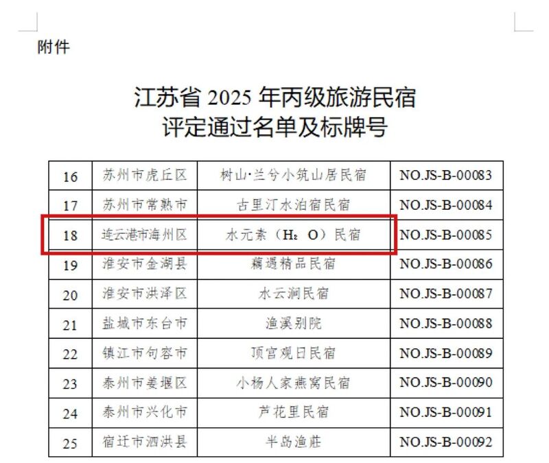 近日,江苏省旅游星级饭店评定委员会公布全省2025 年国家丙级旅游民宿评定名单,连云港市海州区花果山水元素(H₂O)民宿成功上榜。这是继2024年小森居客栈后该区又一获此殊荣的民宿,至此海州国家丙级旅游民宿达3家,彰显“乡村旅游民宿+”融合发展成效,民宿品牌化、高质量发展再上新台阶。