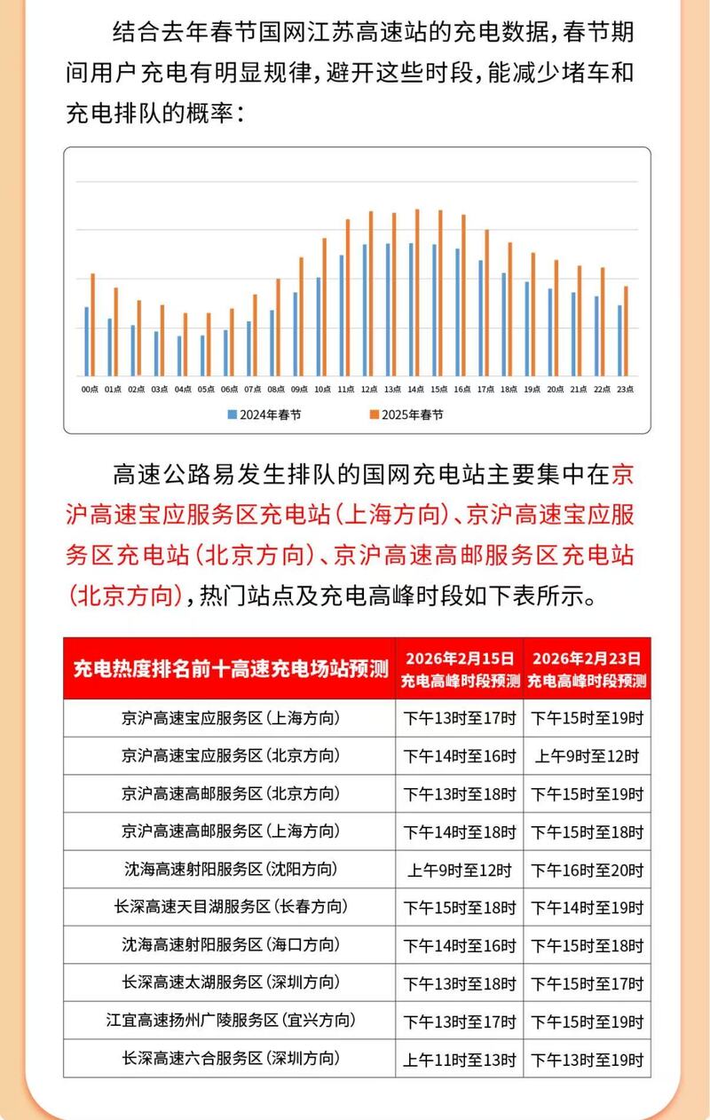“我们根据国庆中秋期间高速充电站的充电流量,筛选了46个高速热门服务区开展充电特别引导服务。”据国网江苏电动汽车公司运营中心负责人宋远军介绍,春节期间,还将根据充电时长,发放差异化优惠券,引导车主“快充快走”,同时在非热门站点实行分时段折扣,优化充电资源利用。