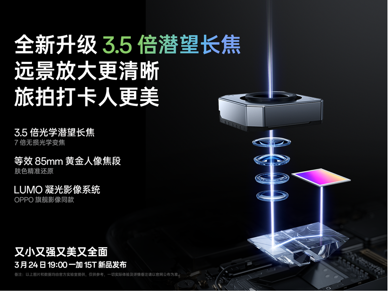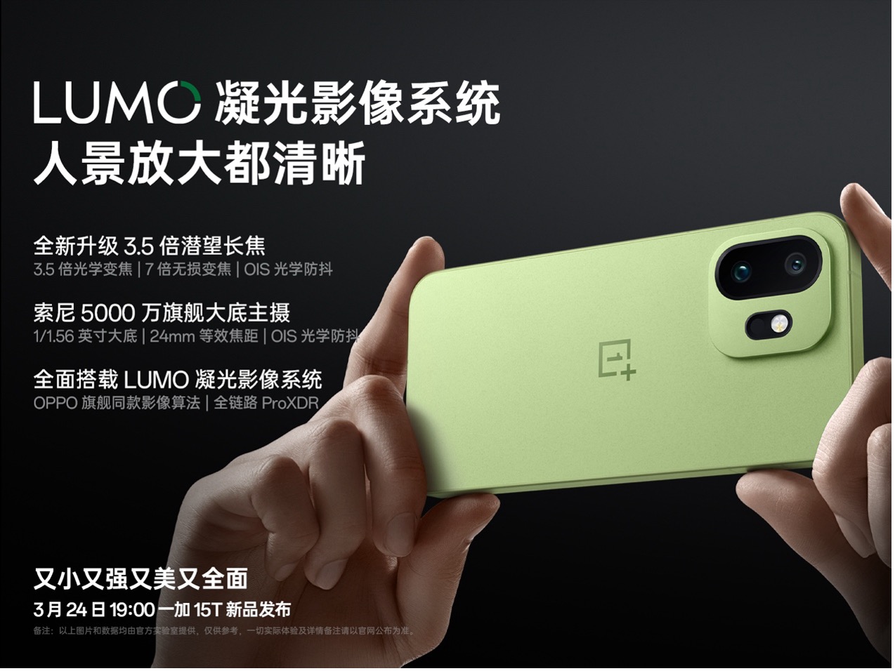 3 月 20 日,一加官宣全新小屏旗舰一加 15T 搭载 5000 万像素主摄和 3.5 倍潜望长焦,在自研 LUMO 凝光影像系统加持下,从光学硬件到算法都有质的提升,可轻松拍出清晰自然的高质感照片。