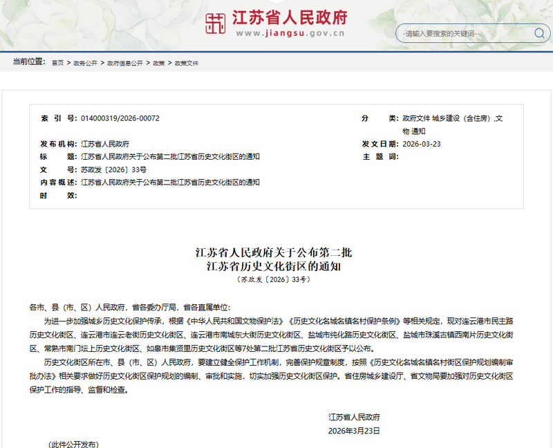 近日,江苏省人民政府公布第二批江苏省历史文化街区,连云港市民主路历史文化街区、连云港市连云老街历史文化街区、连云港市南城东大街历史文化街区、盐城市纯化路历史文化街区、盐城市珠溪古镇西南片历史文化街区、常熟市南门坛上历史文化街区、如皋市集贤里历史文化街区等7处入选。