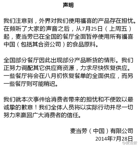 麦当劳在声明中写道:“我们注意到,外界对我们使用福喜的产品存在担忧。在倾听了大家的声音之后,从7月25日(上周五)起,麦当劳已在全国的餐厅全面暂停使用所有福喜中国(包括其合资公司)的食品原料。全国部分餐厅因此出现部分产品断货的情形。我们正努力调配其它供应商资源,力求尽快恢复供应。一些餐厅将会在八月初恢复餐单的全面供应,而另一些餐厅则可能稍迟。我们就本次事件给消费者带来的担忧和不便致以最诚挚的歉意!我们全体人员将以实际行动并尽一切努力来赢回广大消费者的信任。”