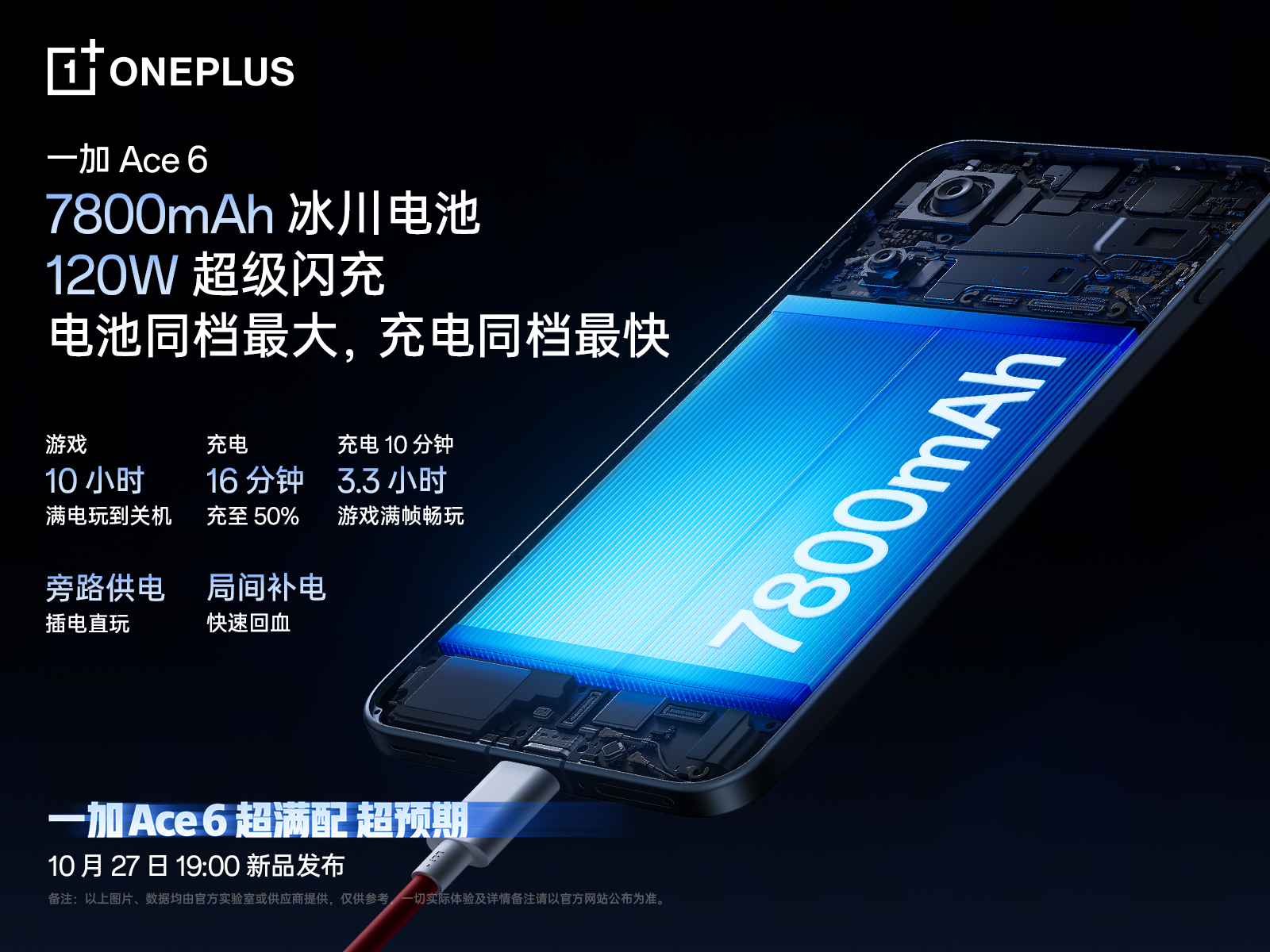 2025 年 10 月 23 日,一加正式宣布「大满配性能完全体」一加 Ace 6 将搭载骁龙 8 至尊版移动平台,带来同档唯一的 165 超高帧游戏体验,配合 7800mAh+120W 闪充的续航配置,一加 Ace 6 将以「Pro 级产品力」带来同档领先的表现,把极致性能和满配体验,带给更多用户。