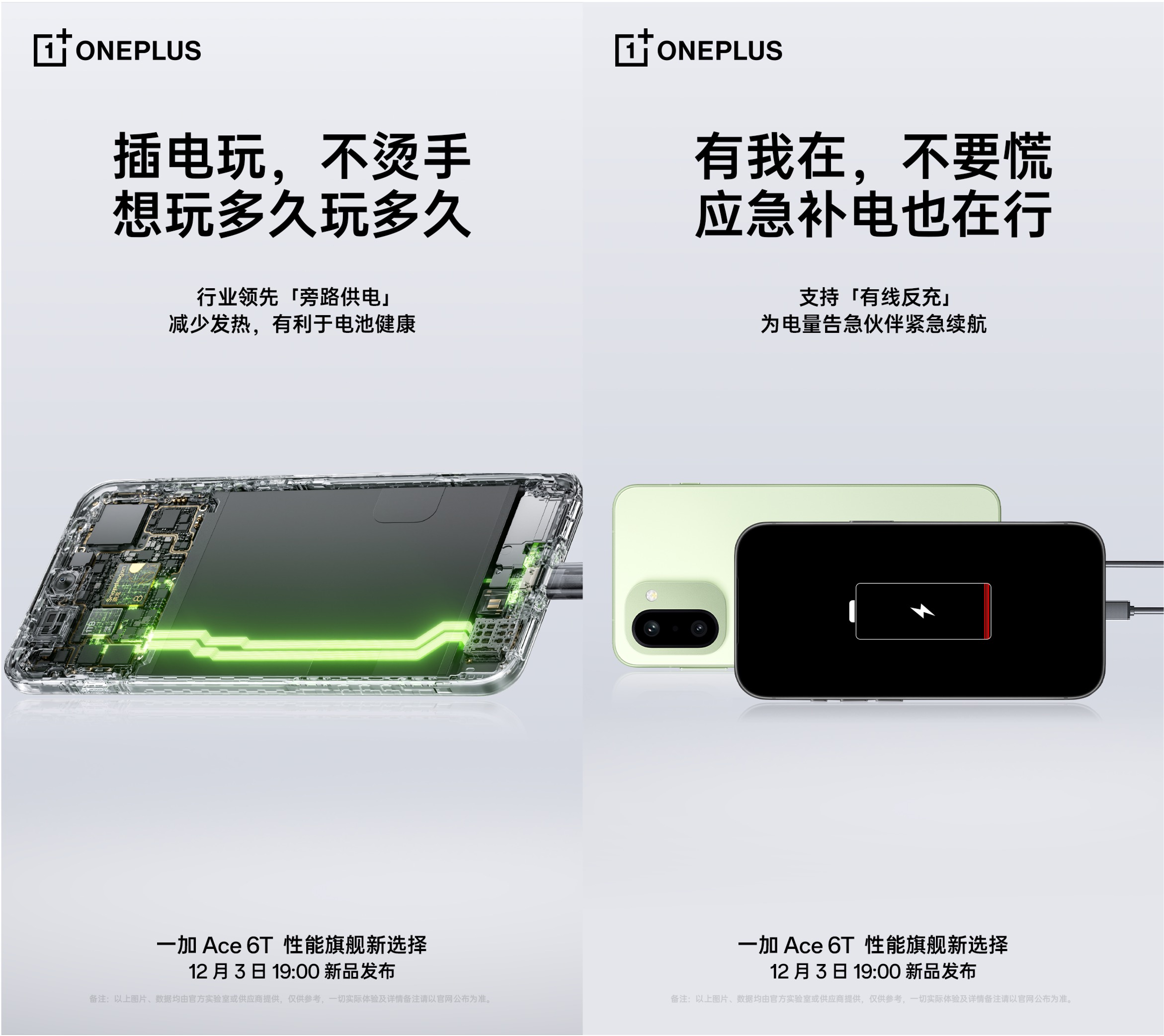 此外,一加Ace 6T支持「旁路供电」和「有线反充」两大充电技术。行业领先的「旁路供电」功能,让一加Ace 6T在边充电边游戏的场景中,电流能绕过电池,直供系统,避免发热升温导致的卡顿,有效延长电池寿命。而有线反充则能为电量告急的其他设备,手表、耳机等产品紧急补电,减少续航烦恼。